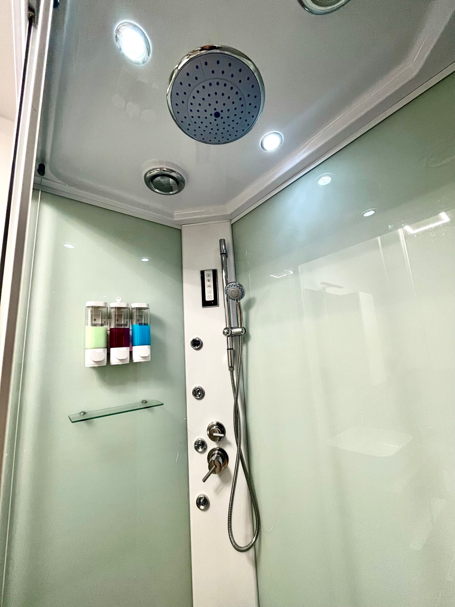 Il bagno di Empoli Charm unisce funzionalità moderna e un tocco di tecnologia dedicato al benessere. La cabina doccia è il cuore della stanza, pensata per chi cerca un’esperienza superiore rispetto a una doccia standard: